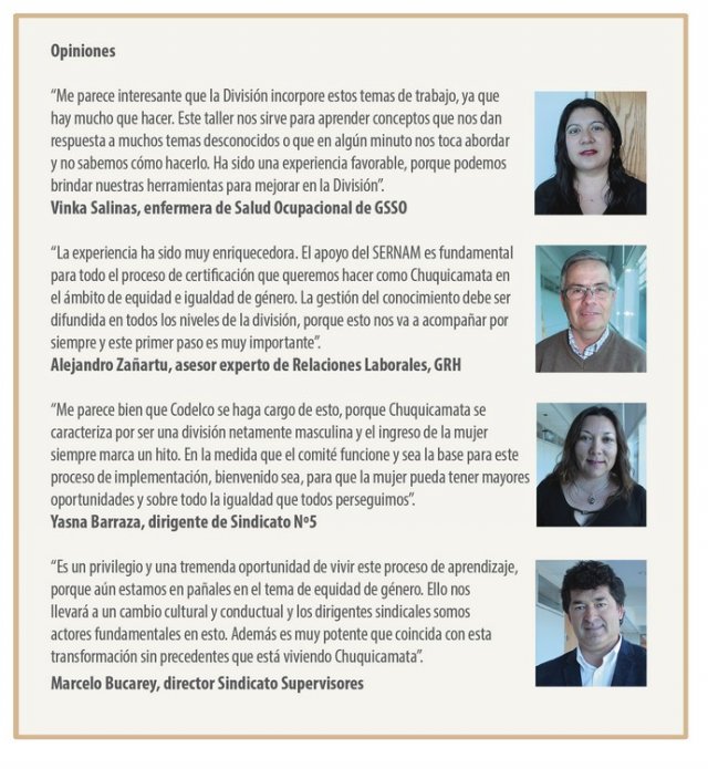 Para alcanzar la certificación de esta norma, Chuquicamata en conjunto con el SERNAM, comenzó una serie de talleres dirigidos a representantes de todos los estamentos de la División, trabajadores, supervisores, dirigentes sindicales e integrantes de la Corporación de Mujeres Trabajadoras del Cobre (Cormutrac), quienes integrarán el Comité de Igualdad de Género a cargo de la implementación de este sistema de gestión.